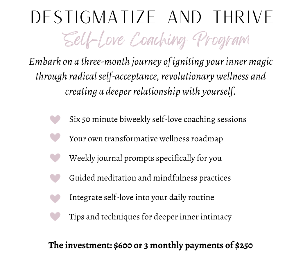 Disclaimer: I am not a licensed mental health professional. I do not diagnose or treat mental health conditions. Self-love coaching is not a substitue for therapy.